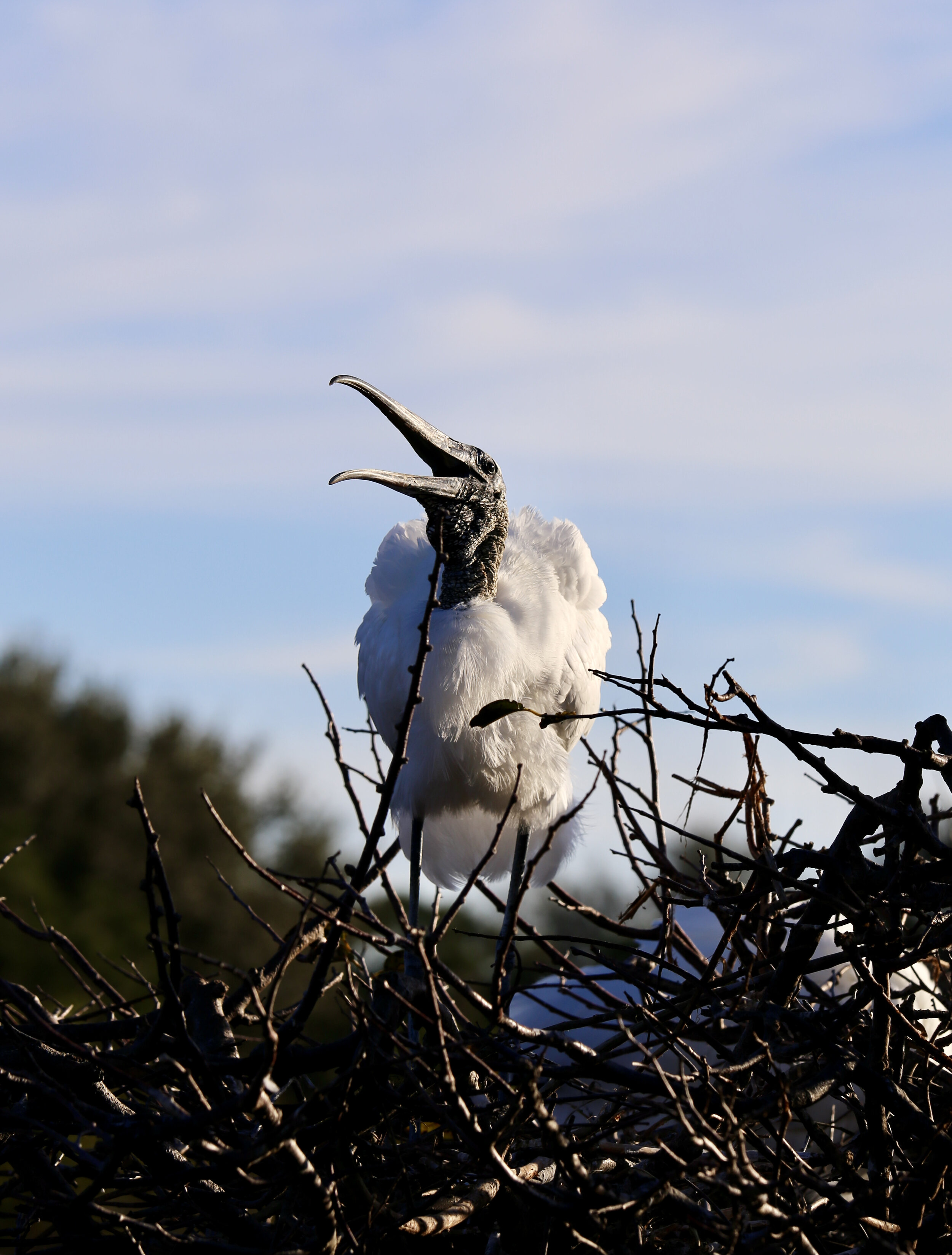The wood stork, a bird of the southeastern U. S., is a large bird, easily three feet long, that is uncommon but often roosts in colonies.