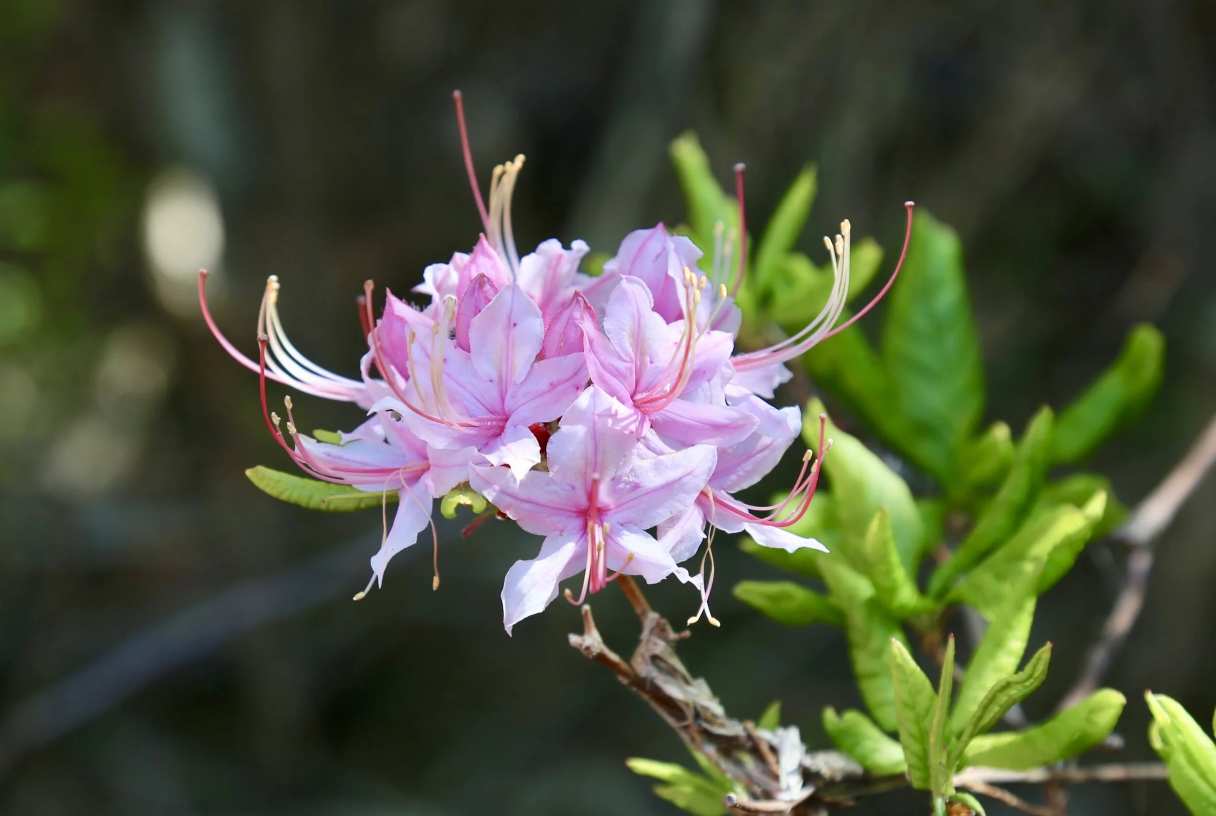 Pinxter flower, or pink azalea, is a native plant with showy blossoms in late May. You’ll see them here and there on the mainland shore in the cove. Click to enlarge.